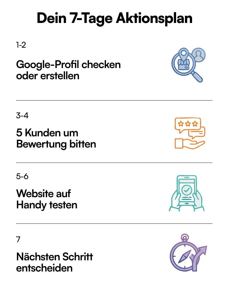 Fang mit dem Google Unternehmensprofil an. Kostet nichts, dauert 30 Minuten.