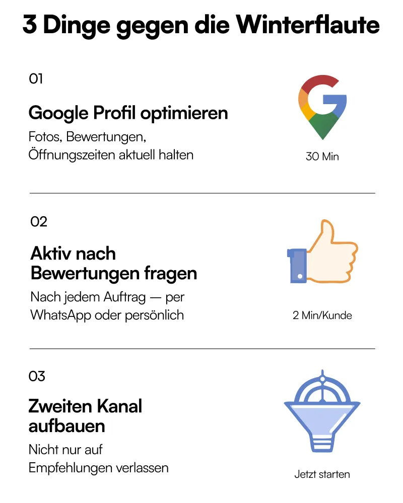 Ja, der Winter ist ruhiger. Das war schon immer so. Aber die Betriebe, die jetzt aktiv werden, stehen im Frühjahr besser da. Die anderen warten weiter – und wundern sich, warum es nicht besser wird. Du hast die Wahl.